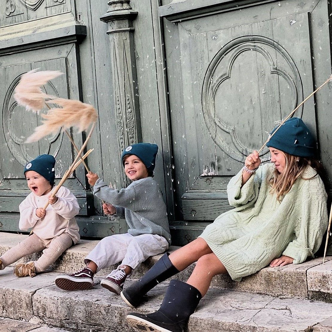 Bonnet mixte en coton biologique de la marque Poule Party en coloris vert bleu.